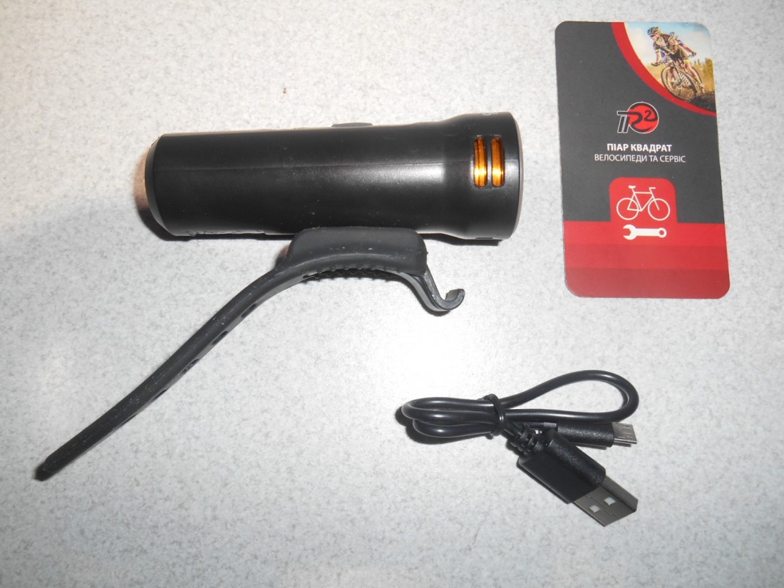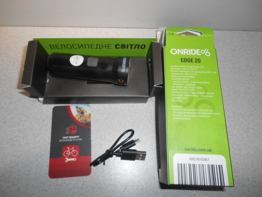 Велофара Onride Edge 20. Колір чорний з написом. Матеріал корпуса - пластик. Елемент живлення - Li-Ion акумулятор 2400 мАг. Заряджання USB мікро-В. Має індикатор заряду батареї. 5 режимів свічення - 2 постійного світла, 3 режими блимання. Час роботи від 2,5 до 6 годин. Кріплення швидкоз"ємне - гумовий хомут. Для вмикання і вимикання - натиснути і утримувати кнопку тривалістю більше секунди, перемикання режимів - звичайне клацання. Вага - 100 грамів. Світловий потік - 500 люмен.