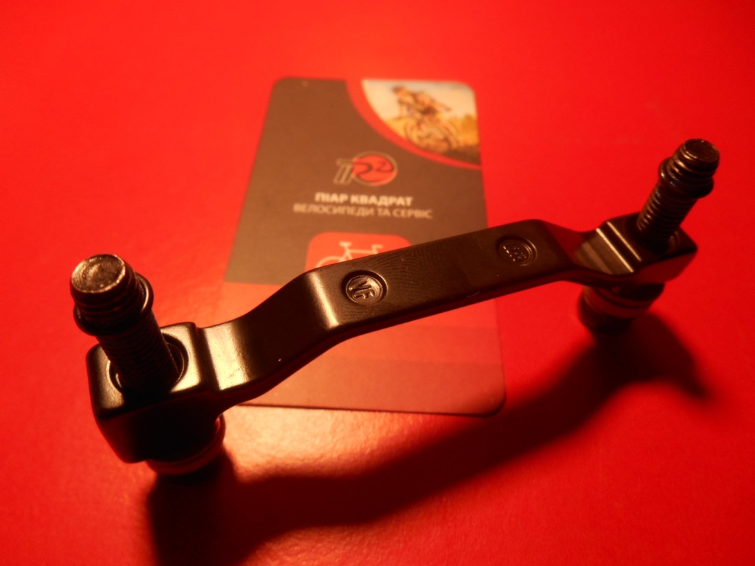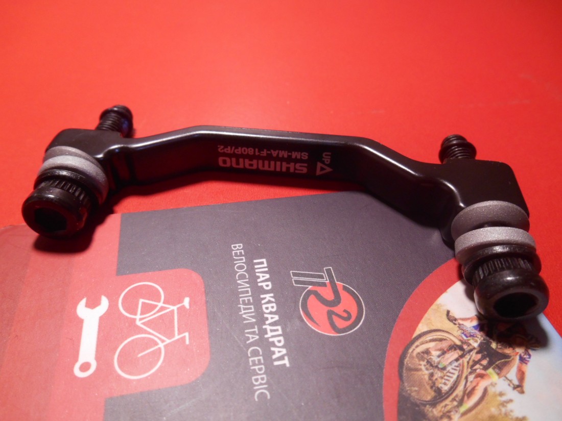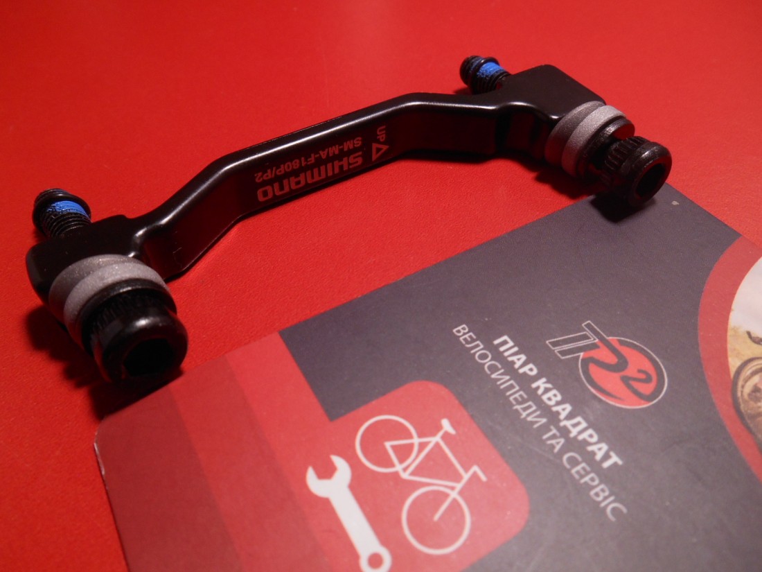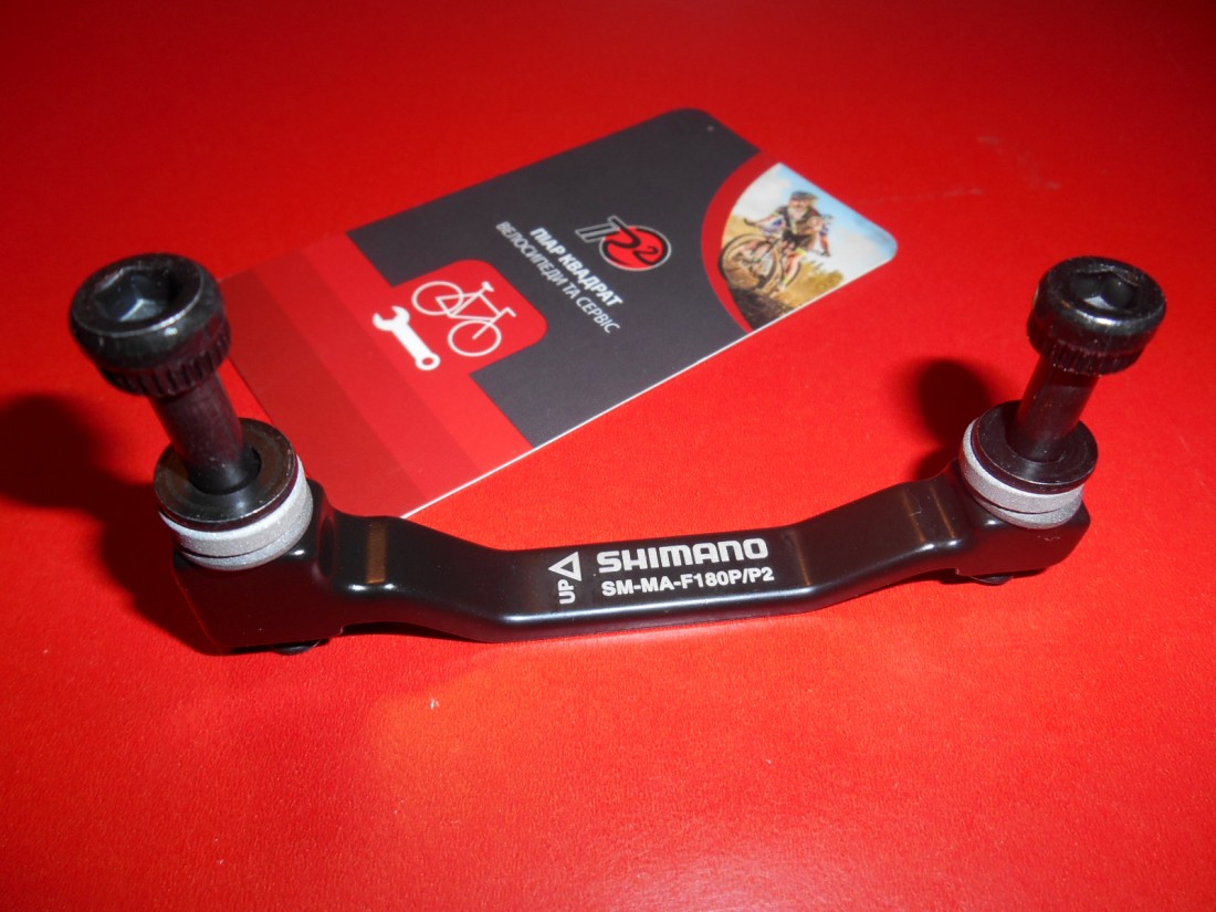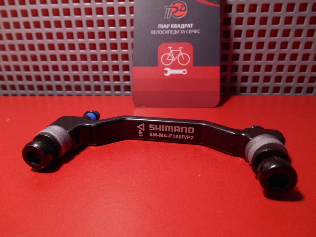 Адаптер каліпера дискових гальм Shimano SM-MA-F180P/P2 з 160 на 180 мм - PM to PM (Post Mount). Адаптер - передній - для вилки, або задній на раму, з болтами відповідної довжини. Відстань між осями отворів - 75 мм. Вага з болтами - 34 грами. Матеріал - алюміній, болти - сталь. Виготовлений в Малайзії.