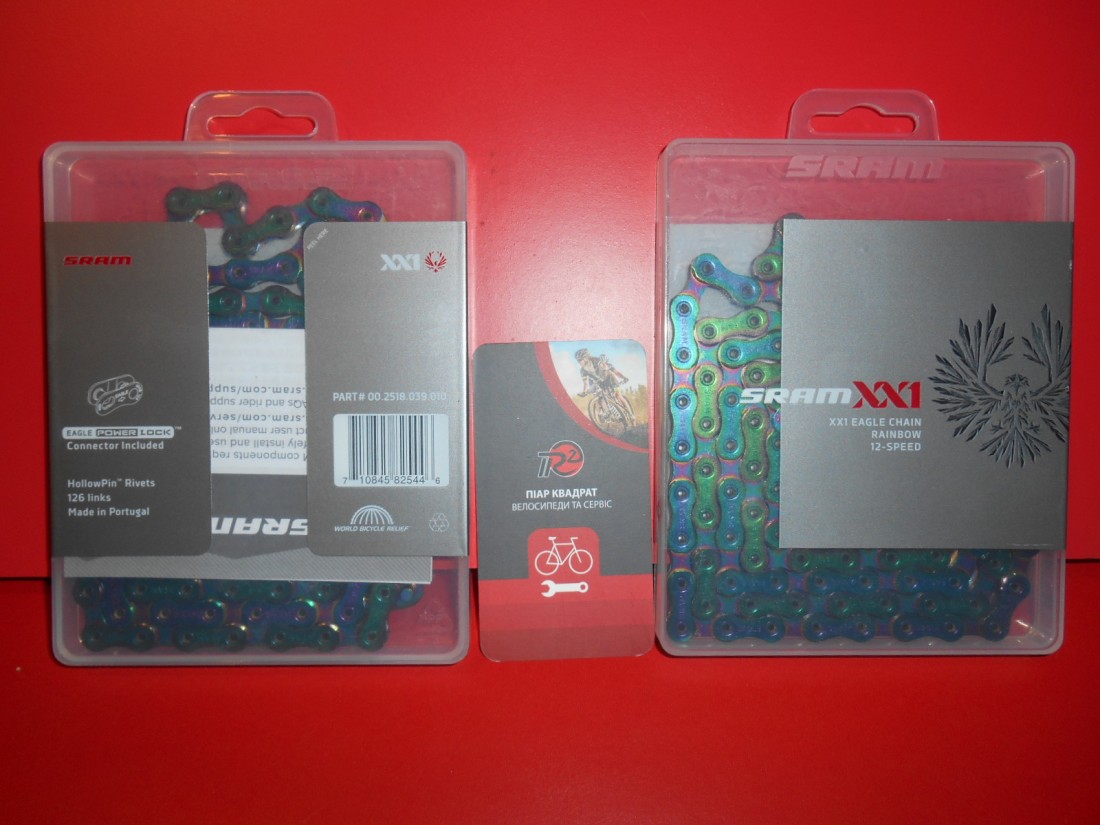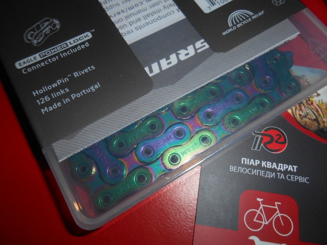 Ланцюг Sram XX1 Eagle, 12 швидкостей Rainbow, веселкового кольору або oil slick - бензинова пляма. Ємність - 126 ланок. Сталь вкрита нітридом титану - зносостійке декоративне і функціональне покриття. Замочок в комплекті. Пустотілі осі ланок Hollow Pin. Виготовлений в Португалії. Оригінал.