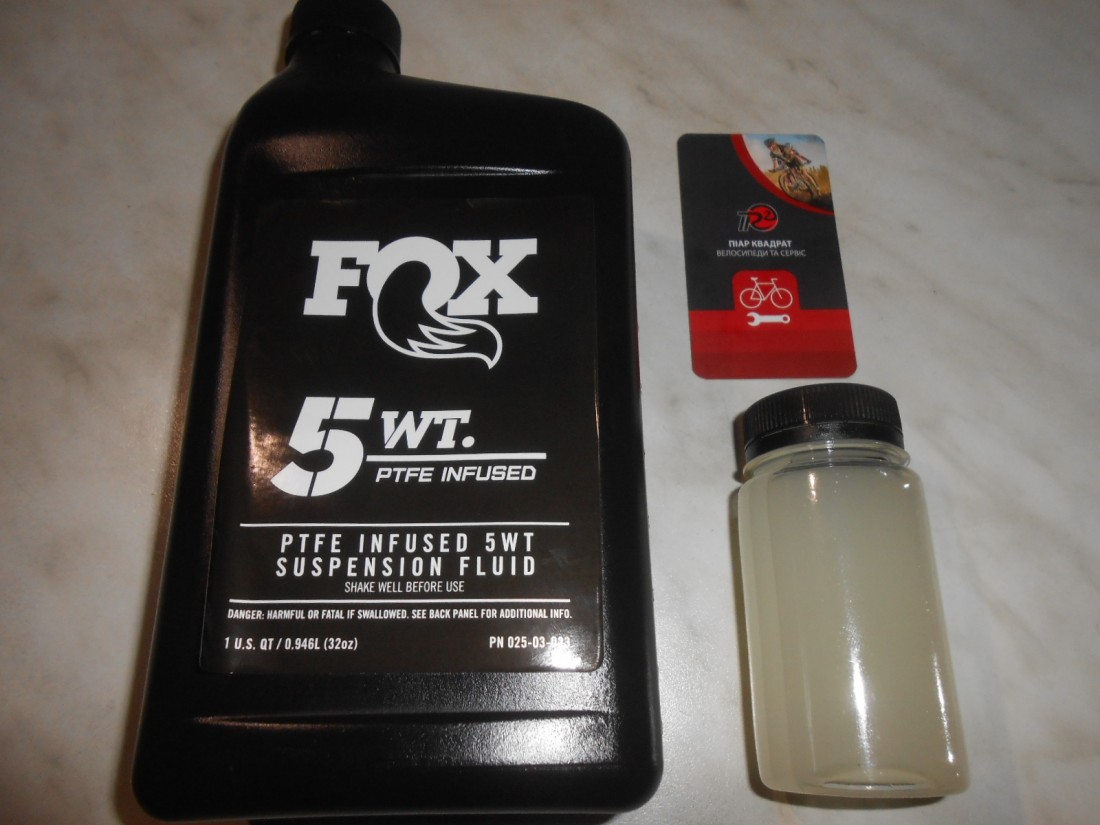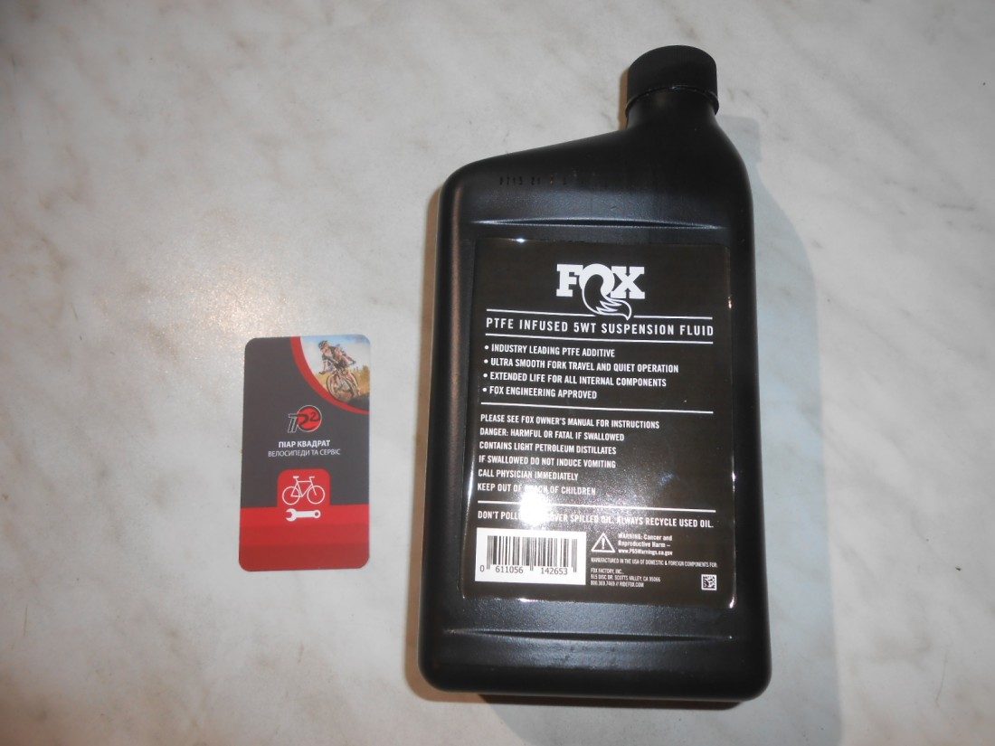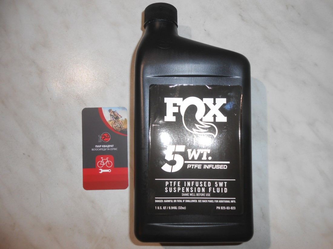 Масло Fox Suspension Fluid 5 WT PTFE Infused. Призначене для вилок Fox з Grip картриджем. Ємність 100 мл. Для яких вилок і кількість є на фото. Матеріал - синтетичне масло з додаванням тефлону (PTFE). Масло білого кольору. Перед наливанням - виробник рекомендує інтенсивно збовтати, щоб перемішалися частинки PTFE які при зберіганні осідають на дно ємності. Серійник виробника - 025-03-023