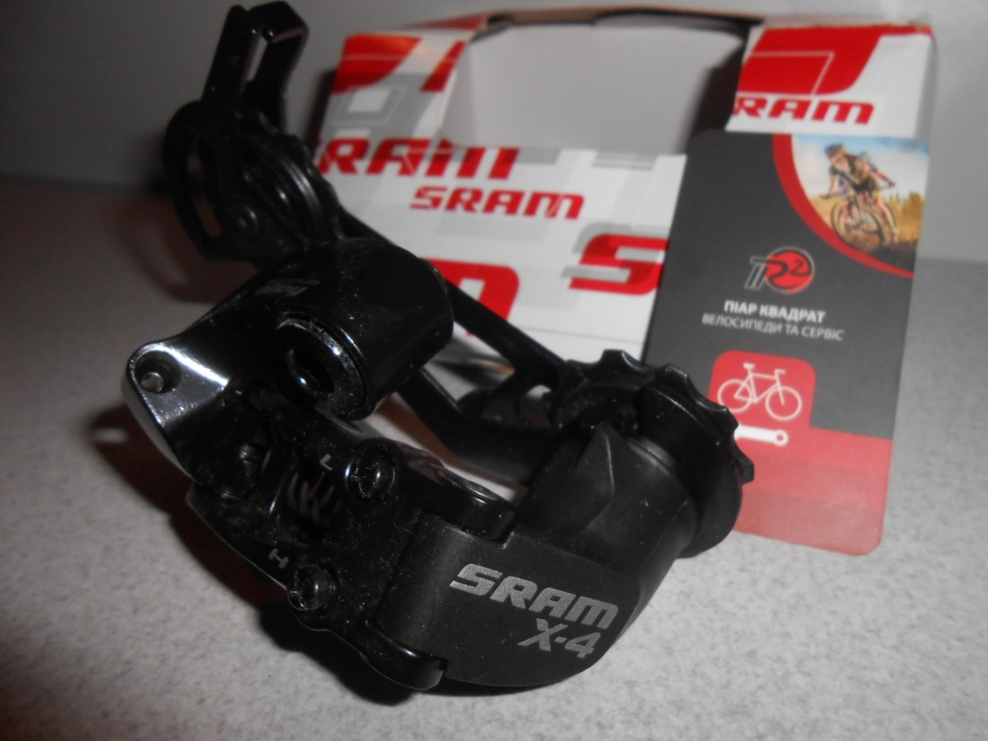 Задній перемикач Sram X4 для 7-8-9 швидкостей, long (довга) лапка. Сумісний з 3x7,8,9, 2x7,8,9, 1х7,8,9 швидкісними трансмісіями. Колір - чорний. Довга лапка - 100 мм по осях роликів, накриває максимально 36 зубів на касеті. В рідній коробці - оригінал. Ролики з"ємні, розбірні, замінні. Застосовані технології - 1:1 Actuation™. Вага - 301 грам. Виготовлений в Китаї.