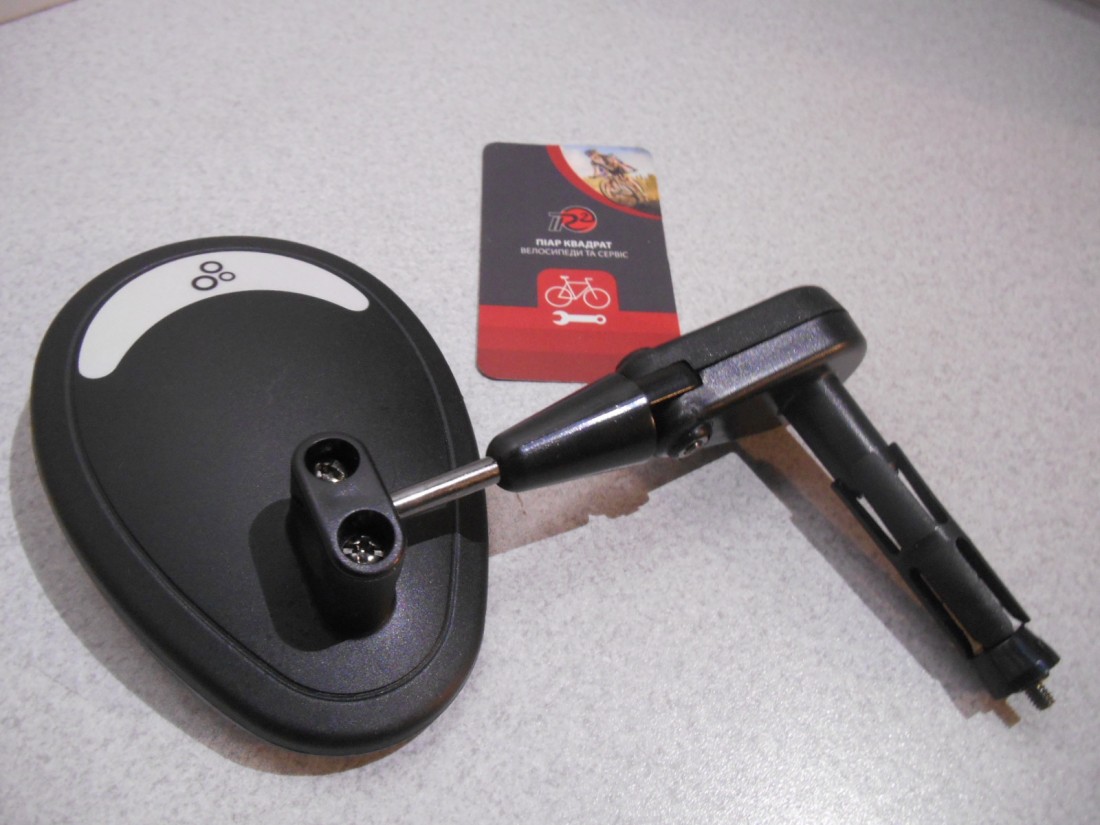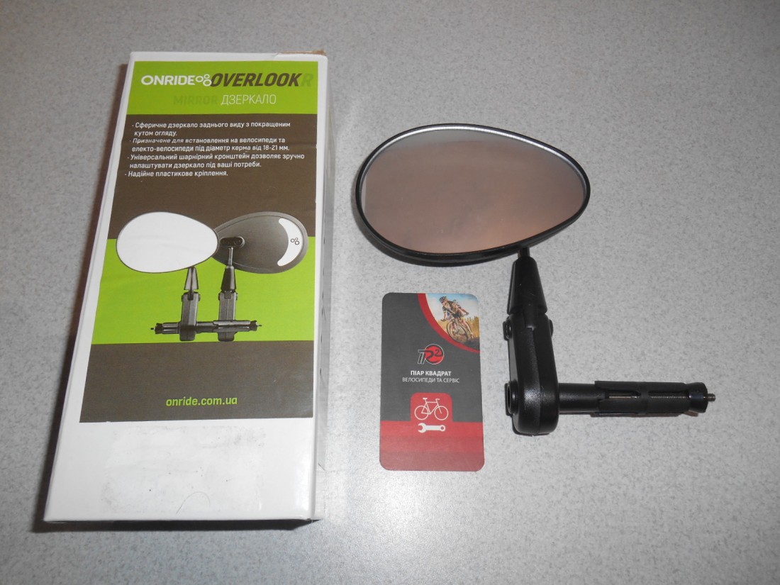 Дзеркало ONRIDE Overlook R сферичне, в кермо ліве. Кріпиться в торець керма зліва керма, внутрішнім розпірним механізмом, влазить в кермо з внутрішнім розміром 18 - 21 мм. Шарнірний кронштейн (пластмасовий) дозволяє значний діапазон регулювання кутів. Вага - 83 грами. Розміри краплі поверхні відбивання 80 х 115 мм (покрите захисною транспортною плівкою). Виготовлене у Тайвані.