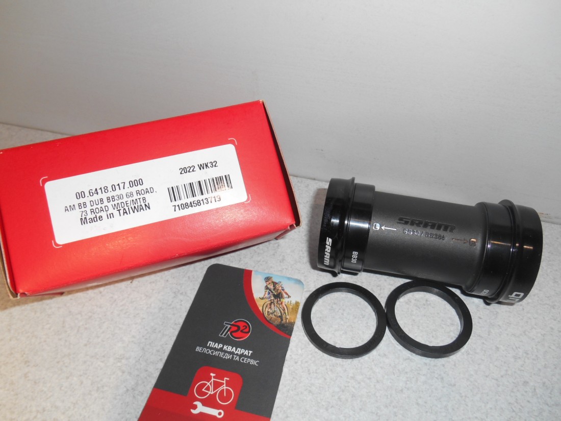 Каретка SRAM DUB BB30 42 x 73 мм. Для рам з діаметром отвора 42 мм, шириною 68-73 мм. Для діаметру вала системи DUB - 28,99 мм. Для МТБ і шосе. Вага - 81 грам з кільцями, вага кілець - 4 грами. В комплекті опорні кільця товщиною 3 і 4,5 мм. Виготовлена в Тайвані.