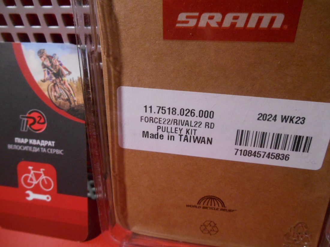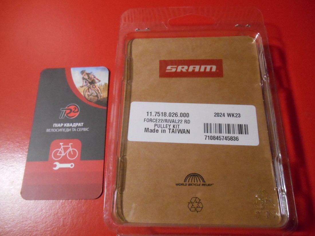 Комплект роликів заднього перемикача Sram Force22, Rival22, що працює з 11 швидкісними перемикачами. В комплекті 2 ролики на промпідшипниках і 4 однакові шайби. Верхній і нижній ролик є однаковими, встановлюються за стрілками на їх корпусі в сторону обертання за рухом ланцюга. Конструкція має звукопоглинальну властивість - технологія AeroGlide. Кількість зубців на кожному ролику - 11. Вага роликів з фурнітурою - 24 грами. Виготовлений в Тайвані.