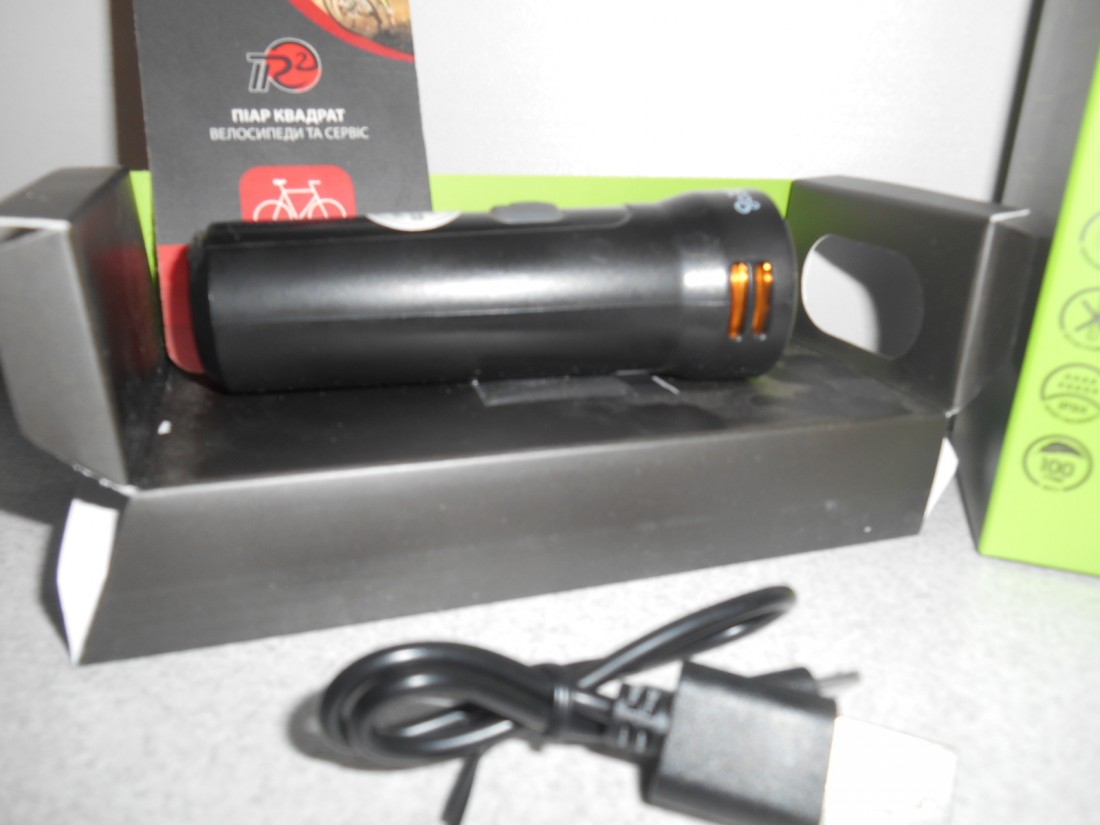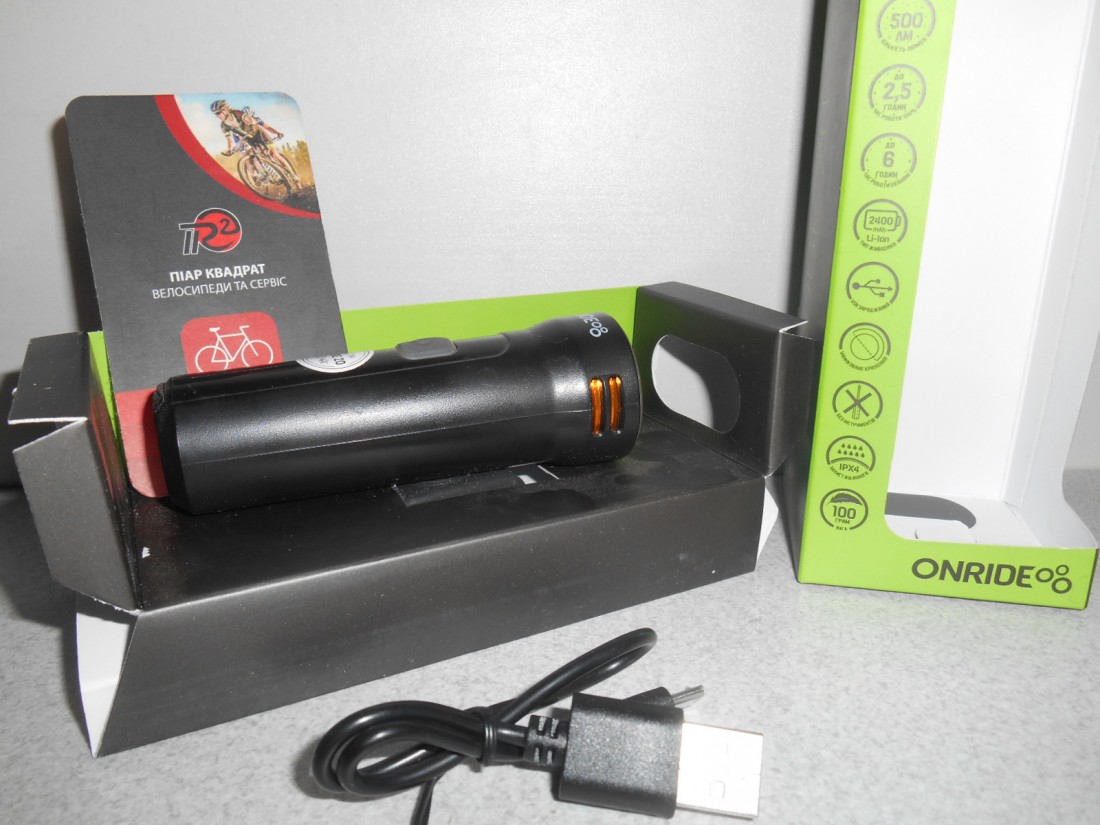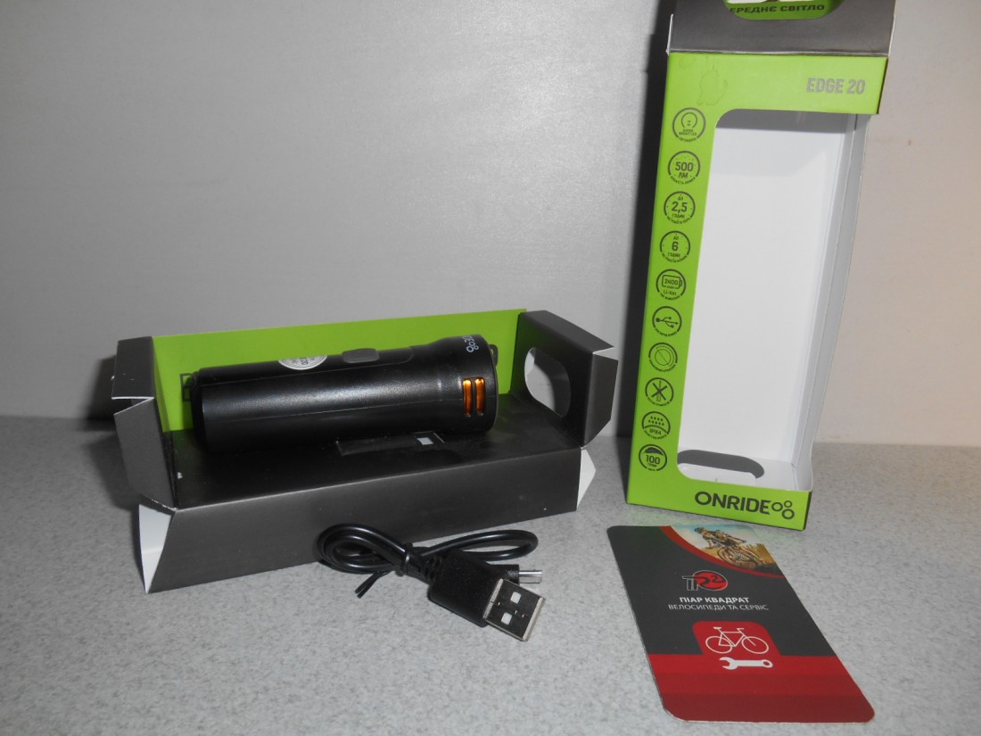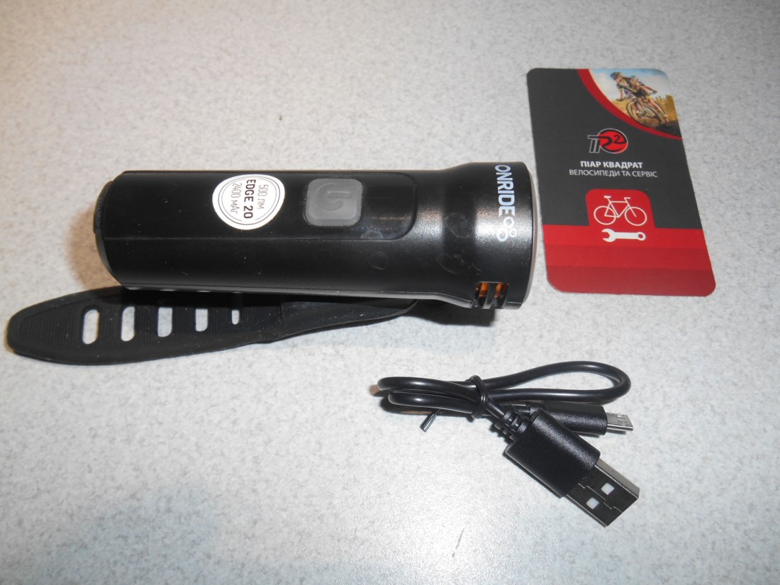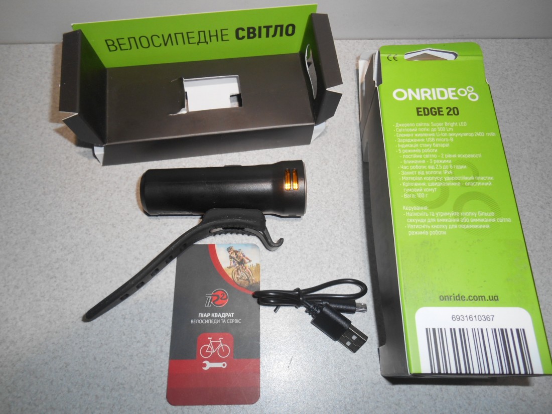 Велофара Onride Edge 20. Колір чорний з написом. Матеріал корпуса - пластик. Елемент живлення - Li-Ion акумулятор 2400 мАг. Заряджання USB мікро-В. Має індикатор заряду батареї. 5 режимів свічення - 2 постійного світла, 3 режими блимання. Час роботи від 2,5 до 6 годин. Кріплення швидкоз"ємне - гумовий хомут. Для вмикання і вимикання - натиснути і утримувати кнопку тривалістю більше секунди, перемикання режимів - звичайне клацання. Вага - 100 грамів. Світловий потік - 500 люмен.