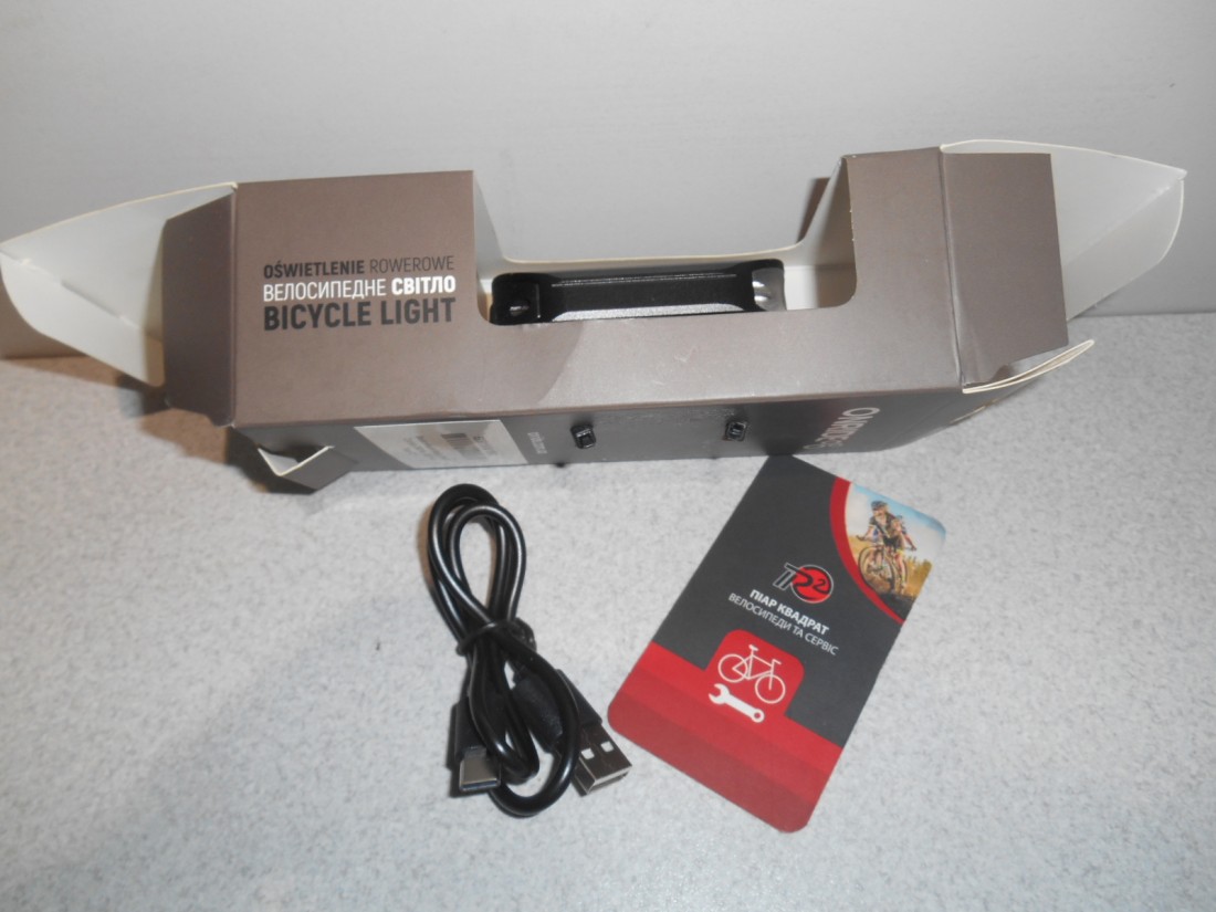Велофара Onride Cyclop. Колір чорний з написом. Матеріал корпуса - анодований алюмінієвий сплав. Елемент живлення - Li-Pol акумулятор 1200 мАг. Заряджання USB Type-С - час заряджання до 2 годин. Має індикатор заряду батареї. 5 режимів свічення - 3 постійного світла, 2 режими блимання. Час роботи від 2 до 6 годин. Кріплення швидкоз"ємне - гумовий хомут. Для вмикання і вимикання - натиснути і утримувати кнопку тривалістю більше секунди, перемикання режимів - звичайне клацання. Вага - 89 грамів. Світловий потік - 350 люмен.