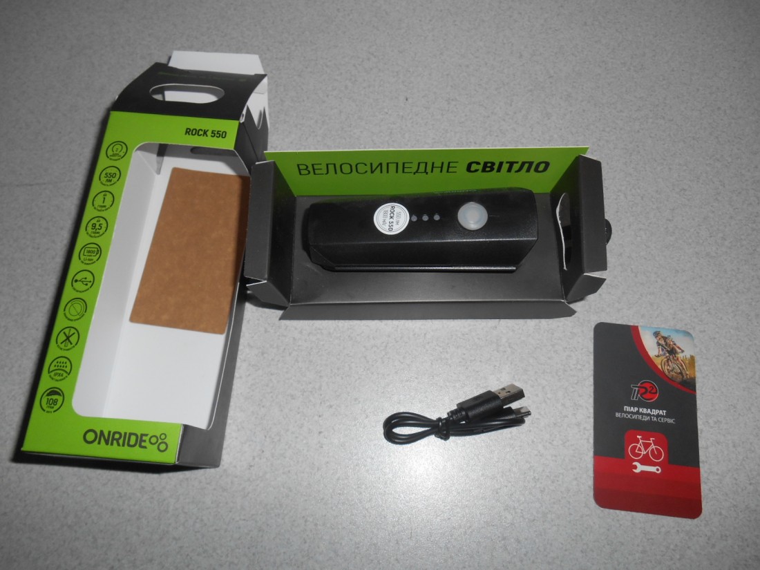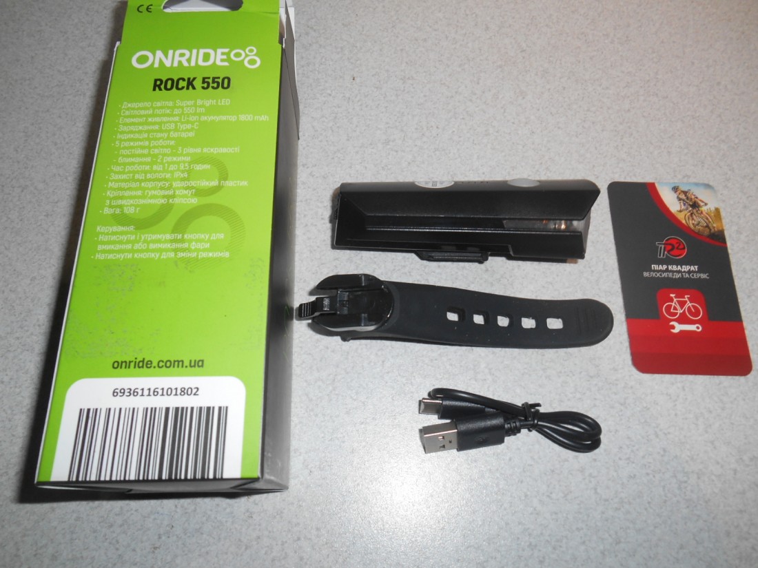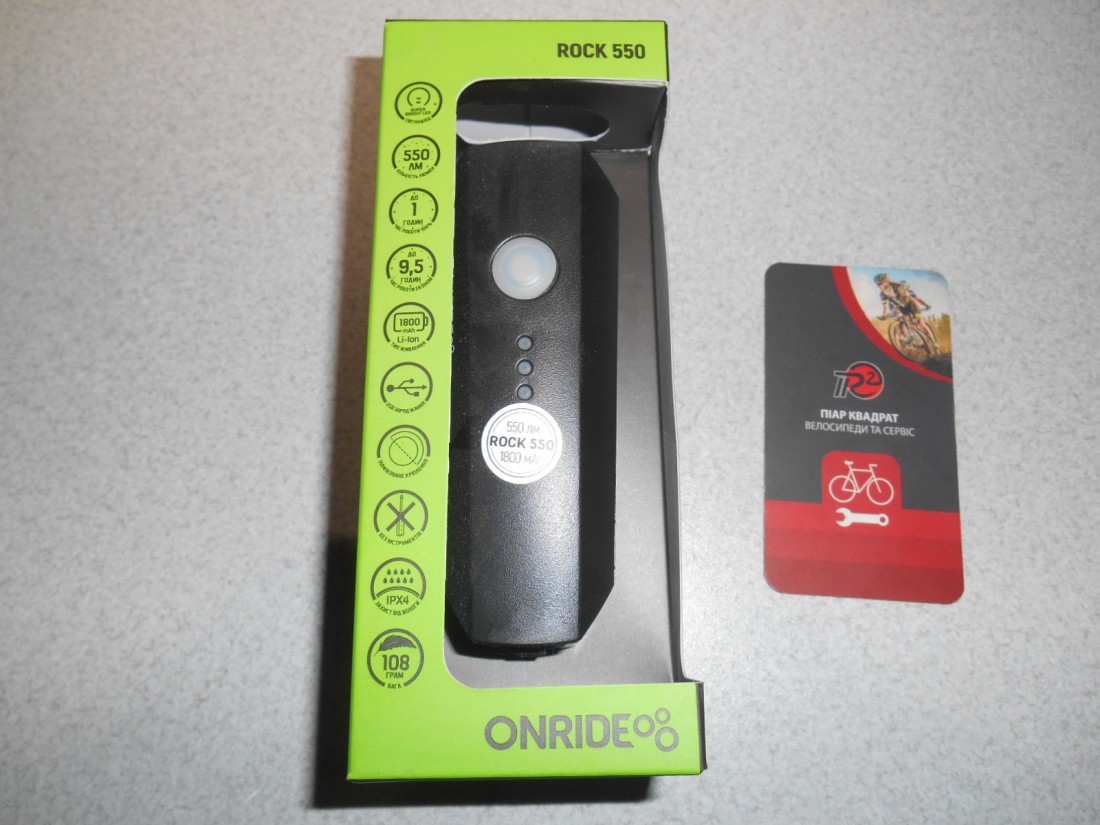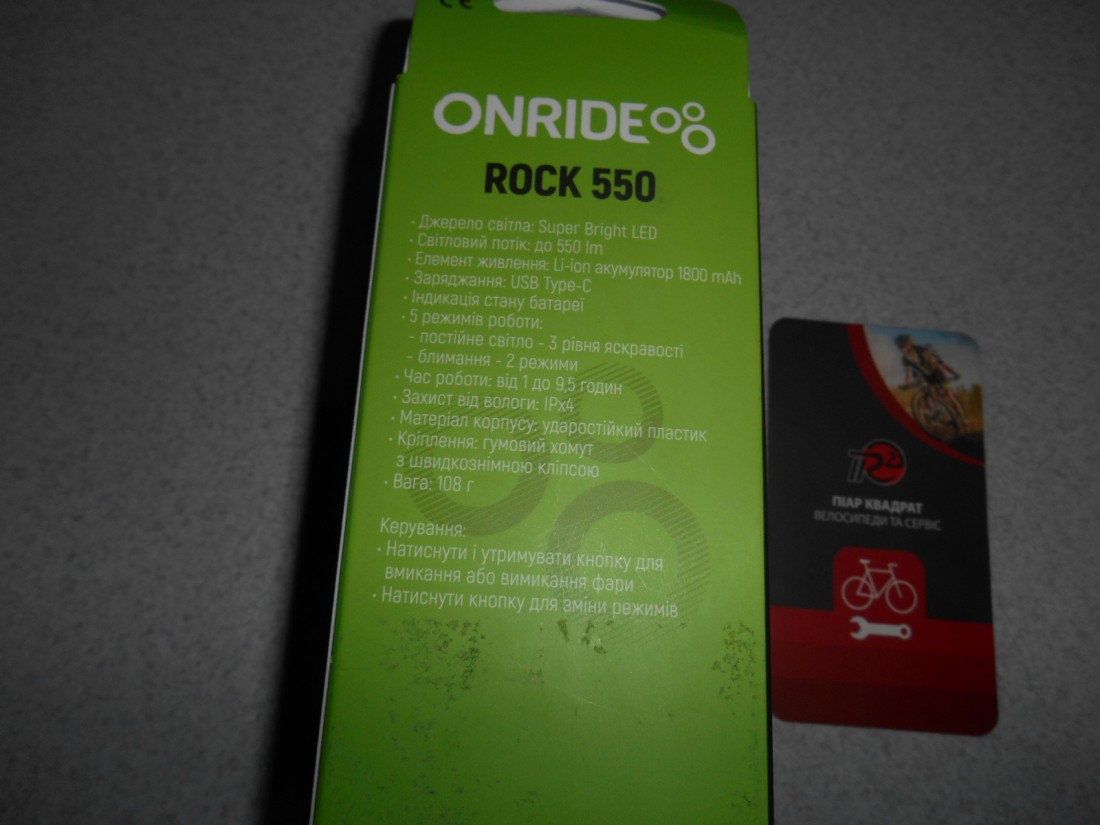 Велофара Onride Rock 550. Колір чорний з написом. Матеріал корпуса - ударостійкий пластик. Елемент живлення - Li-Ion акумулятор 1800 мАг. Заряджання USB Type-Сн. Має індикатор заряду батареї. 5 режимів свічення - 3 постійного світла, 2 режими блимання. Час роботи від 1 до 9,5 годин. Кріплення швидкоз"ємне - гумовий хомут. Для вмикання і вимикання - натиснути і утримувати кнопку тривалістю більше секунди, перемикання режимів - звичайне клацання. Вага - 108 грамів. Світловий потік - 550 люмен.